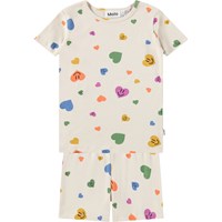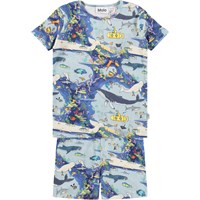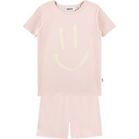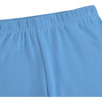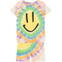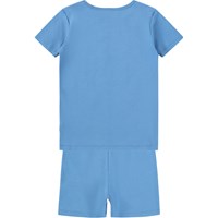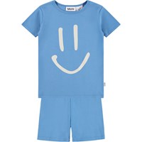 Blauwe pyjama met korte mouwen en pijpen gemaakt van elastisch zacht biologisch katoen. De pyjama is tweedelig en bestaat uit een los T-shirt met een ronde hals en een korte legging met een elastische taille waardoor het comfortabel is om te dragen. De pyjama heeft een print van een lachend wit gezicht