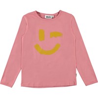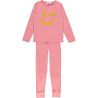 Roze pyjama met lange mouwen en een smiley print aan de voorkant. De broek heeft koordjes in de taille.