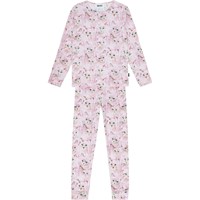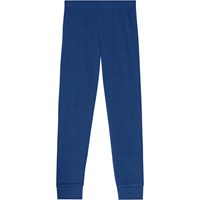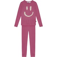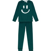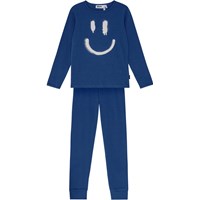 Donkerblauwe pyjama van biologisch katoen met een elastische taille en ribboorden rond de enkels. Het bovenstuk heeft een ronde hals en een grote wit gespoten smiley aan de voorkant.