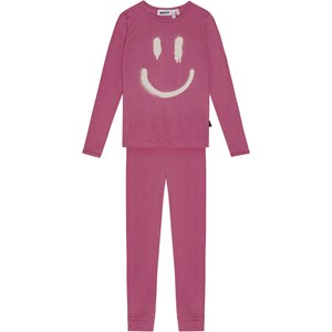 Donkerroze pyjama van biologisch katoen met een elastische taille en ribboorden rond de enkels. Het bovenstuk heeft een ronde hals en een grote wit gespoten smiley aan de voorkant.