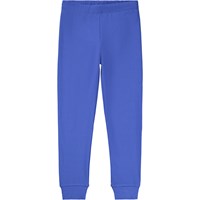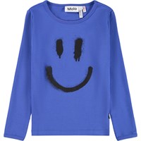 Blauwe pyjama gemaakt van biologisch katoen. De broek heeft een elastische taille en ribboorden rond de pijpen. Het pyjamajasje heeft een ronde hals en een print aan de voorkant. De print is een grote met spuitverf aangebrachte glimlach in het zwart.