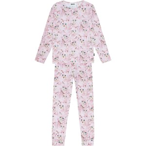 Paarse pyjama van biologisch katoen met een elastische tailleband en ribboorden rond de enkels. Het bovenstuk heeft een ronde hals. De pyjama heeft een all-over print van schattige poezen.