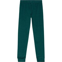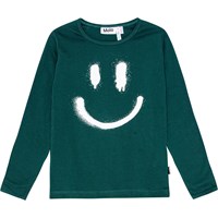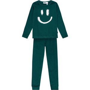 Donkergroene pyjama van biologisch katoen met een elastische taille en ribboorden rond de enkels. Het bovenstuk heeft een ronde hals en een grote wit gespoten smiley aan de voorkant.