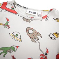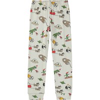 Beige pyjama gemaakt van biologisch katoen. De broek heeft een elastische taille en ribboorden rond de pijpen. Het pyjamajasje heeft een ronde hals. De pyjama heeft een kleurrijke print van kerstmis in de ruimte.