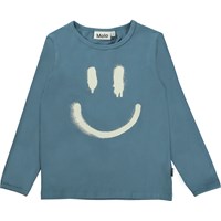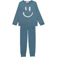 Pyjama in het blauw met een print van een smiley op de bovenkant. De broek heeft een elastische tailleband met koordjes.