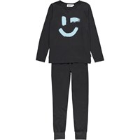 Donkerblauwe pyjama met lange mouwen en een smiley print aan de voorkant. De broek heeft koordjes in de taille.
