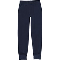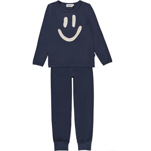 Tweedelige pyjama in het donkerblauw met op de voorkant een smiley print. De broek heeft koordjes in de taille en de top heeft lange mouwen.