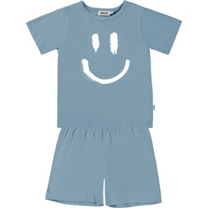 Pyjama in het blauw met een print van een smiley op het t-shirt. De short heeft elastiek en koordjes in de taille.