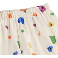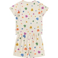 Beige pyjama met korte mouwen en pijpen gemaakt van elastisch zacht biologisch katoen. De pyjama is tweedelig en bestaat uit een T-shirt met een ronde hals en een korte broek met een elastische taille waardoor het comfortabel is om te dragen. De pyjama heeft een print van kleurrijke lachende harten.
