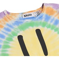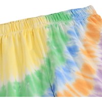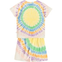 Kleurrijke pyjama met korte mouwen en pijpen gemaakt van elastisch zacht biologisch katoen. De pyjama is tweedelig en bestaat uit een T-shirt met een ronde hals en een korte broek met een elastische taille waardoor het comfortabel is om te dragen. De pyjama heeft een uniek kleurrijk tie-dye patroon met op de voorkant een lachend gezicht. Let op dat al onze tie-dye handgemaakt is, wat een uniek patroon creëert dat varieert van stijl tot stijl.
