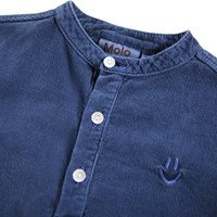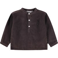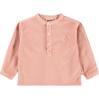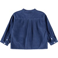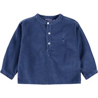 Donkerblauw fluwelen shirt voor de kleintjes gemaakt van biologisch katoen. Het shirt heeft een opstaande kraag en een knoopsluiting met drie witte knopen. De ruimvallende pasvorm maakt het comfortabel om te dragen en gemakkelijk aan en uit te trekken. Op de borst is een klein roze lachend gezicht geborduurd. Combineer het met de bijpassende broek of shorts voor een complete outfit.