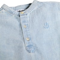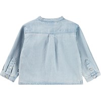 Langemouwenshirt voor de kleintjes, in lichtblauw denim gemaakt van biologisch katoen. Het shirt heeft een zachte, ronde kraag en een knoopsluiting aan de voorkant, wat het comfortabel en gemakkelijk maakt om aan en uit te trekken.