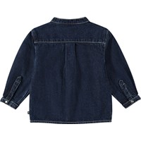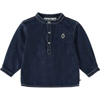 Donkerblauw spijkerblouse voor baby's en peuters met een opstaande kraag en knoopsluiting. De blouse heeft drie witte knopen en een ruime pasvorm, waardoor het comfortabel is om te dragen en gemakkelijk is aan te trekken. Op de borst is een kleine witte lachende smiley geborduurd.