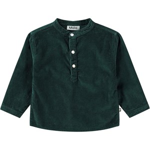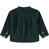 Donkergroene blouse van biologisch katoen voor baby's en peuters. De blouse is gemaakt van zachte geribbelde babyribfluweel en heeft een mandarijnkraag en een knoopsluiting met drie witte knopen. Het heeft een ruime pasvorm, waardoor het comfortabel is om te dragen en gemakkelijk is aan te trekken.