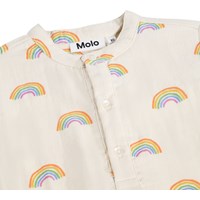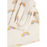Crèmekleurig shirt met lange mouwen en een regenboogprint, gemaakt van zachte, biologische katoen voor de kleintjes. Het shirt heeft een zachte, ronde kraag en een knoopsluiting aan de voorkant, wat het comfortabel en gemakkelijk maakt om aan en uit te trekken.