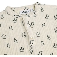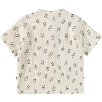 Crèmekleurig, kort mouwloos poloshirt voor de kleintjes, met muziekprint gemaakt van zachte, biologische katoenen mousseline. Het shirt heeft een kleine kraag en een knoopsluiting aan de voorkant, wat het licht en comfortabel maakt voor warme dagen.