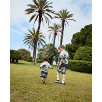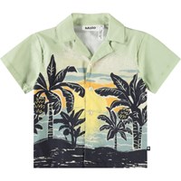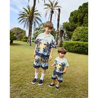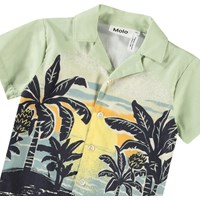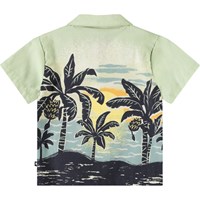 Blouse met korte mouwen van biologisch katoen voor de kleintjes. De blouse heeft een mooie kraag en knoopsluiting met lichte parelmoeren knopen, waardoor het makkelijk aan te trekken is. Het shirt is lichtgroen met een print van palmbomen in een zonsondergang. Voor een complete outfit combineer je het met de bijpassende korte broek.