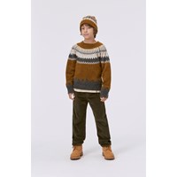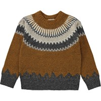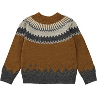 Bruine gebreide trui met grafisch detail. Deze trui is gemaakt van een heerlijke mix van alpacawol, perfect voor koude dagen. Het heeft een ronde hals met een gebreide ribboord, raglanmouwen en gebreide ribboord aan de mouwen en onderkant. Deze trui heeft een prachtig Scandinavisch geïnspireerd patroon rond de hals in grijs- en beigetinten. Het heeft een normale pasvorm.