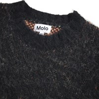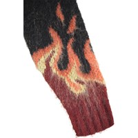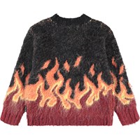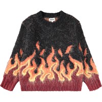 Gebreide trui in rood en zwart gemaakt van een zachte alpacawolmix. De trui heeft een ronde hals en ribboorden rond de hals, mouwen en taille. Het heeft een ruimvallende pasvorm en een grafisch vlammotief onderaan de mouwen en taille.