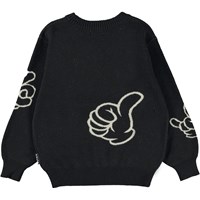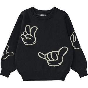 Zwarte gebreide trui met een wit patroon van verschillende handen, die verschillende handsignalen creëren. Hoeveel van hen ken jij? Deze gebreide trui is in een katoen/wol mix, heeft lange mouwen, een ronde hals met gebreide ribboord en ribboord aan de mouwen en onderkant. Deze trui heeft een ruimvallende pasvorm.