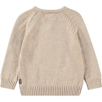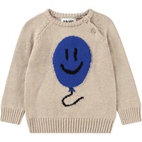 Beige trui, voor baby's en peuters, met een vrolijke blauwe ballon op de buik. De trui heeft een ronde hals, geribbelde boorden en knoopjes bij de hals, waardoor het gemakkelijk is om aan en uit te trekken.