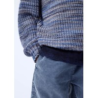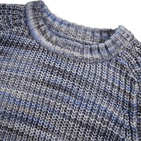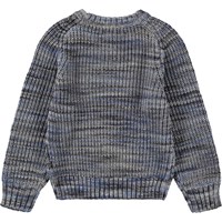 Kleurrijke gebreide trui in blauwtinten gemaakt van een wolmix. De trui heeft raglanmouwen en een ronde hals. De trui heeft ribboorden rond de hals, mouwen en taille. Het heeft een normale pasvorm.