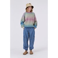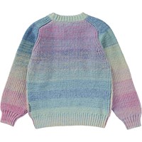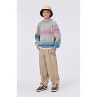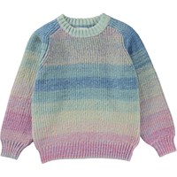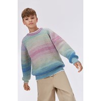 Gebreide trui in een pastel melange. De kleuren variëren van lichtblauw tot mintgroen tot lichtpaars in een naadloze overgang die zorgt voor een spannende, frisse uitstraling. Deze trui is in een katoen/wolmix, heeft raglanmouwen, een ronde hals met gebreide ribboord, lange mouwen en ribboord aan de mouwen en onderkant.