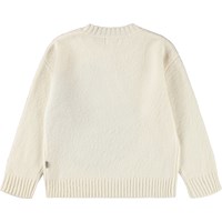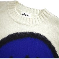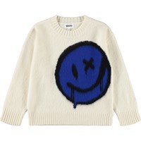 Gebroken witte gebreide trui van wol. De trui heeft op de voorkant een grote blauwe lachende gezicht en ribboorden rond de hals, mouwen en taille. Het heeft een normale pasvorm.