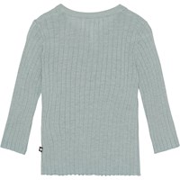 Voor kleine kinderen een grijsgroene vest in ribstof van een zachte viscosemix. Het vest sluit nauw aan en heeft een ronde hals met een kleine ribboord. Het heeft een parelmoerkleurige knoopsluiting. Voor een zachte luxe set kun je het vest dragen met een bijpassende broek .