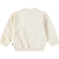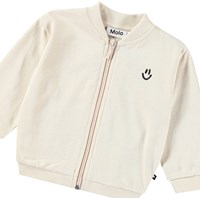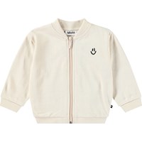 Witte babysweater van biologisch katoen voor de kleintjes. De sweater heeft een rits, ribboorden en op de borst een geborduurde smiley. De binnenkant van de sweater is ongeborsteld, wat het aangenaam koel maakt op warme dagen.