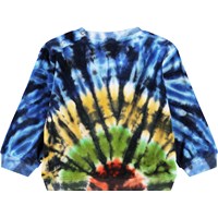Multicoloured tie-dye sweater voor de kleintjes gemaakt van biologisch katoenen velours. De sweater heeft ribboorden rond de taille en mouwen en een ronde hals met twee drukknopen bij de nek om het gemakkelijk aan en uit te kunnen trekken. Al onze tie-dye is handgemaakt wat zorgt voor een uniek patroon dat varieert van stijl tot stijl.