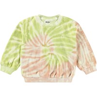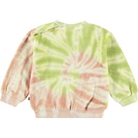Groene en roze tie-dye trui, voor baby's en peuters, van biologisch katoenen fluweel met een zachte binnenkant, waardoor het aangenaam koel is op een warme dag. De trui heeft geribbelde boorden rond de taille en mouwen, evenals een ronde hals met twee drukknopen aan de achterkant, waardoor hij gemakkelijk is om aan en uit te trekken.