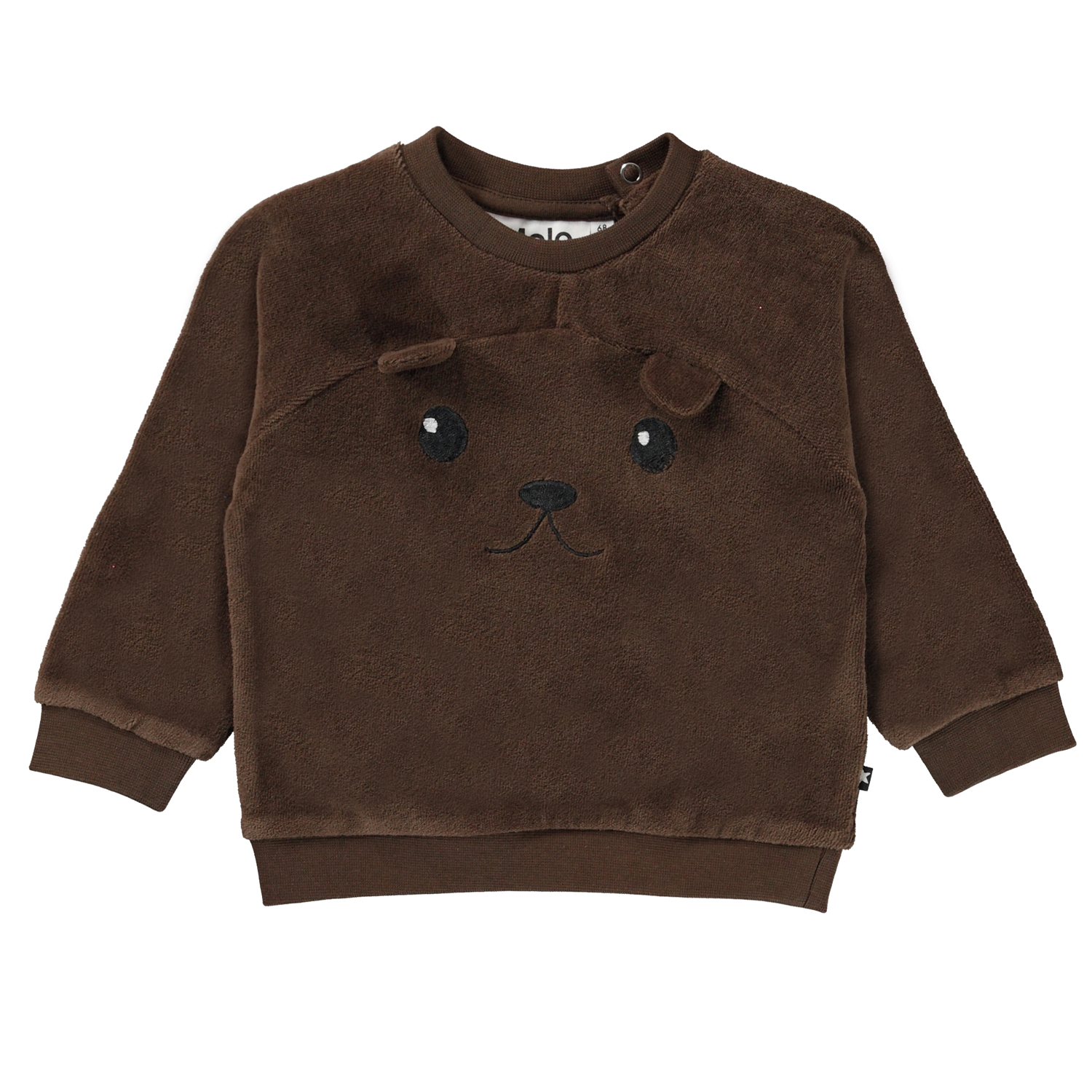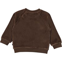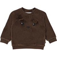 Derry is een donkerbruine fluwelen babytrui met op de voorkant een geborduurd gezicht en kleine oortjes. Draag het met de bijpassende babybroek.