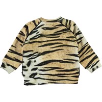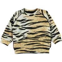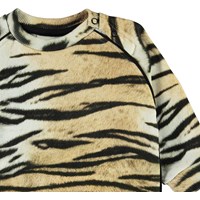 Dicte is een babytrui in een tijgerprint. Het heeft raglanmouwen en drukknopen aan één kant.