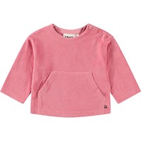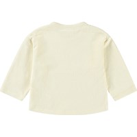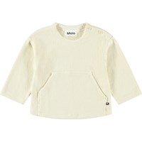 Off-white sweater van zacht geribbeld fluweel voor baby's en peuters. De sweater heeft een ronde hals met twee knopen, waardoor hij gemakkelijk is om aan en uit te trekken. Hij heeft ook lange mouwen en een kangoeroezak aan de voorkant.