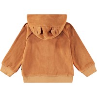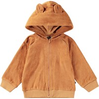 Bruine hoodie, voor baby's en peuters, gemaakt van biologisch katoenen fluweel met een gevoerde binnenkant die zacht en warm is om te dragen. De hoodie heeft teddyberen oren, een rits aan de voorkant, lange mouwen en geribbelde boorden aan de taille en mouwen.