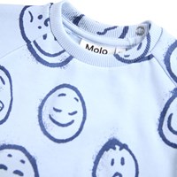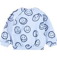 Lichtblauwe sweater voor de kleintjes gemaakt van zacht biologisch katoen met een print van gezichten in verschillende stemmingen. De sweater heeft raglanmouwen, ribboorden rond de taille en mouwen en een ronde hals met twee drukknopen bij de nek om het gemakkelijk aan en uit te trekken. Combineer het met de bijpassende broek voor een complete set.