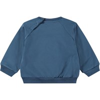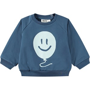Blauwe sweater, voor baby's en peuters, van biologisch katoenen jersey met een gevoerde binnenkant, waardoor het zacht en warm is om te dragen. De sweater heeft raglanmouwen, geribbelde boorden rond de taille en mouwen, en een ronde hals met twee drukknopen aan de achterkant, waardoor het gemakkelijk is om aan en uit te trekken. Op de voorkant van de sweater staat een print van een grote lichtblauwe en vrolijke ballon.