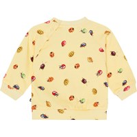 Voor kleine kinderen een gele trui van biologisch katoenen jersey. De trui heeft ribboorden rond de mouwen, hals en onderkant. Op de schouder zitten twee drukknopen. De trui heeft een print van schattige kleurrijke lieveheersbeestjes en slakken. Voor een complete zachte jersey set kun je deze stijl dragen met een bijpassende broek.