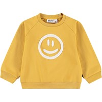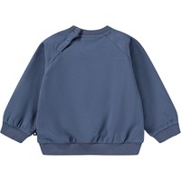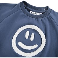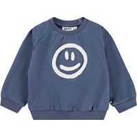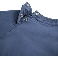 Donkerblauwe sweater voor de kleintjes gemaakt van zacht biologisch katoen met op de voorkant een geborduurd lachend gezicht. De sweater heeft raglanmouwen, ribboorden rond de taille en mouwen en een ronde hals met twee drukknopen aan de achterkant om het gemakkelijk aan en uit te trekken. Combineer het met de bijpassende broek voor een complete set.