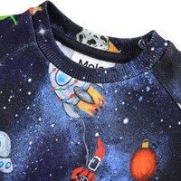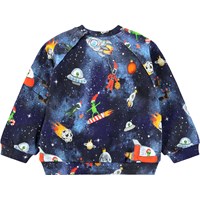 Donkerblauwe sweater voor de kleintjes gemaakt van zacht biologisch katoen met een print van het leven in de ruimte. De sweater heeft raglanmouwen, ribboorden rond de taille en mouwen en een ronde hals met twee drukknopen bij de nek om het gemakkelijk aan en uit te trekken. Combineer het met de bijpassende broek voor een complete set.