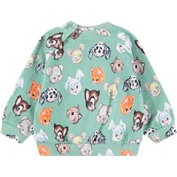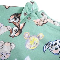 Groene sweater voor de kleintjes gemaakt van zacht biologisch katoen met een kleurrijke print van oude tekenfilmfiguren. De sweater heeft raglanmouwen, ribboorden rond de taille en mouwen en een ronde hals met twee drukknopen aan de achterkant om het gemakkelijk aan en uit te trekken. Combineer het met de bijpassende broek voor een complete set.