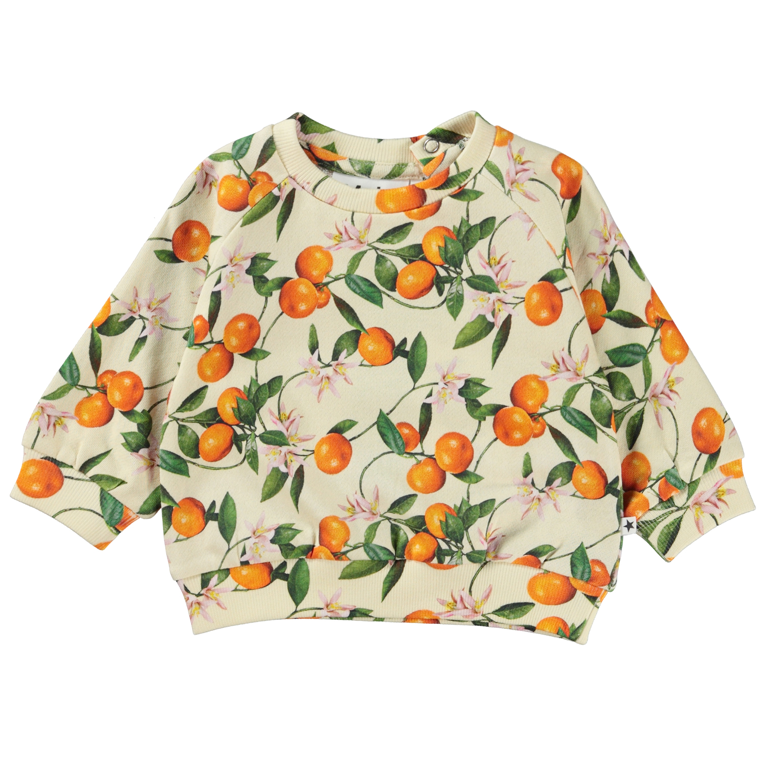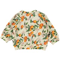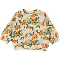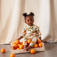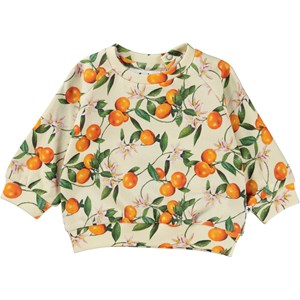 Disc is een lichtgele babytrui met een print van mandarijnen. De trui heeft drukknopen aan de achterkant bovenin. Draag het met de bijpassende baby joggingbroek.