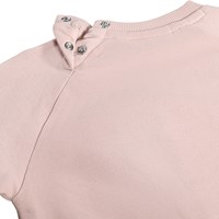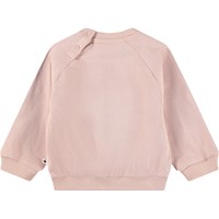 Roze, zachte sweatshirt voor de kleintjes gemaakt van biologisch katoen met opgenaaide kunstwerken. De sweatshirt heeft raglanmouwen, geribde randen en een ronde halslijn met drukknoopjes aan de achterkant, om het gemakkelijk aan en uit te trekken.