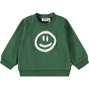Donkergroene sweater voor de kleintjes gemaakt van zacht biologisch katoen met op de voorkant een geborduurd lachend gezicht. De sweater heeft raglanmouwen, ribboorden rond de taille en mouwen en een ronde hals met twee drukknopen aan de achterkant om het gemakkelijk aan en uit te trekken. Combineer het met de bijpassende broek voor een complete set.