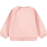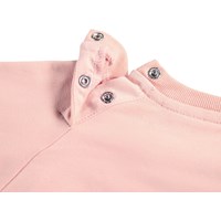 Roze sweater voor de kleintjes gemaakt van zacht biologisch katoen met op de voorkant een geborduurd lachend gezicht. De sweater heeft raglanmouwen, ribboorden rond de taille en mouwen en een ronde hals met twee drukknopen aan de achterkant om het gemakkelijk aan en uit te trekken. Combineer het met de bijpassende broek voor een complete set.