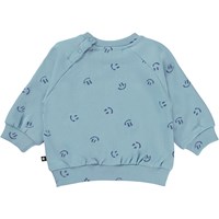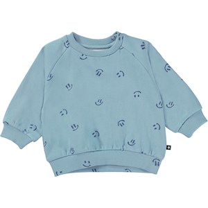 Blauwe sweater voor de kleine kinderen met een donkerblauwe print van kleine, lieve lachende gezichtjes. Deze sweater is van 100% katoen en heeft een ronde hals met een ribboord en ribboord aan de mouwen en onderkant. Het heeft drukknopen aan de achterkant. Voor de perfecte look draag je de sweater met de Simeo joggingbroek die de "Animal Living” print heeft.