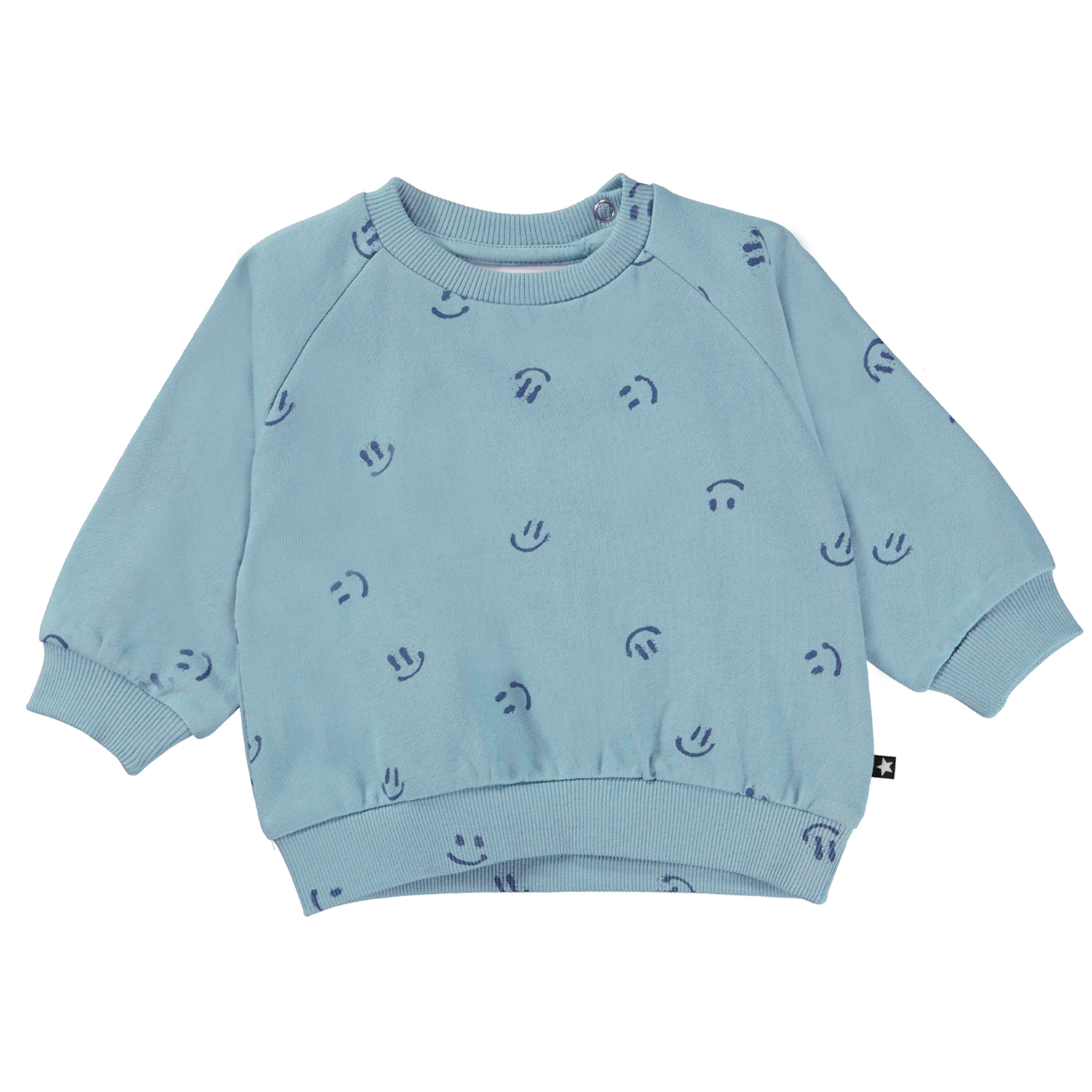 Blauwe sweater voor de kleine kinderen met een donkerblauwe print van kleine, lieve lachende gezichtjes. Deze sweater is van 100% katoen en heeft een ronde hals met een ribboord en ribboord aan de mouwen en onderkant. Het heeft drukknopen aan de achterkant. Voor de perfecte look draag je de sweater met de Simeo joggingbroek die de "Animal Living” print heeft.