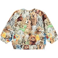 Kleurrijke sweater, voor baby's en peuters, van biologisch katoenen jersey met een zachte binnenkant, waardoor het aangenaam koel is op warme dagen. De sweater heeft raglanmouwen, geribbelde boorden rond de taille en mouwen, en een ronde hals met twee drukknopen aan de achterkant, waardoor het gemakkelijk is om aan en uit te trekken. Het heeft een all-over print van knuffelende, gezellige of gewoon feestende beren.