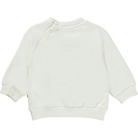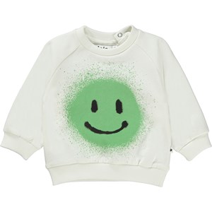 Disc is een witte babytrui met op de voorkant een groene smiley. De trui heeft drukknopen aan de achterkant bovenin. Draag het met de bijpassende baby joggingbroek.